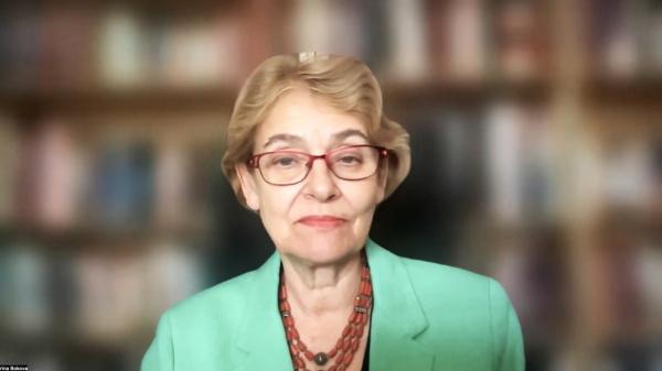 教育部中國(guó)聯(lián)合國(guó)教科文組織全國(guó)委員會(huì)副秘書(shū)長(zhǎng)葛思穎和聯(lián)合國(guó)教科文組織前總干事、第二屆蘭花獎(jiǎng)終身榮譽(yù)獎(jiǎng)獲得者伊琳娜·博科娃視頻致辭。