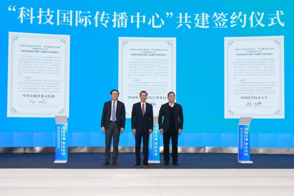 為探索科技國際傳播新模式,建設高端科技國際傳播平臺,中國外文局、安徽省委宣傳部、中國科學技術大學共同發(fā)起成立了“科技國際傳播中心”,舉行了“科技國際傳播中心”簽約儀式。